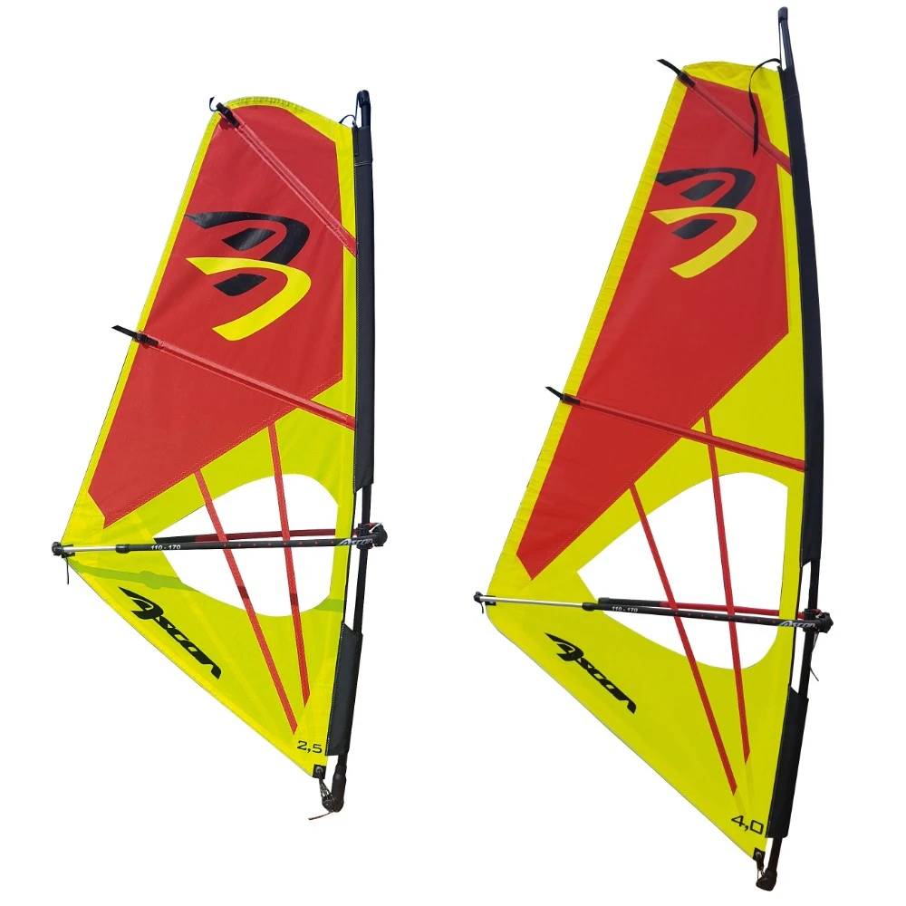 Hochwertiges Jugend- und Damenrigg aus Dacron mit PVC Fenster, stabiler Gabel und Epoxymast. Die Riggs werden mit Tampenset, Skinnyadapter, Segel und Riggtasche geliefert.