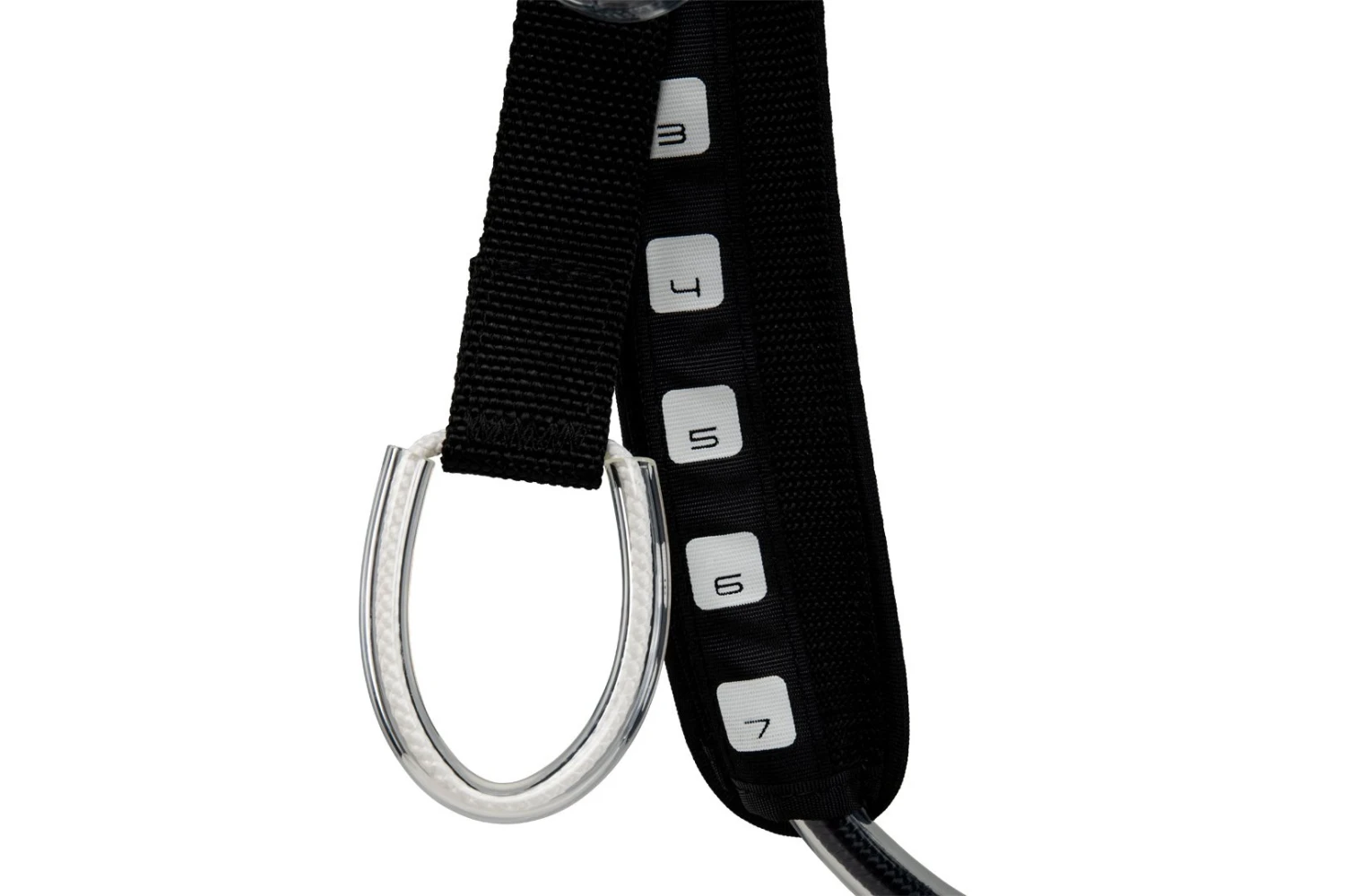 This harness lines design features a heavy-duty stainless steel buckle that allows length adjustments while sailing. Lines can be shortened by pulling on a dedicated loop while pressing the stainless steel buckle will unlock the line and allow it to be extended.